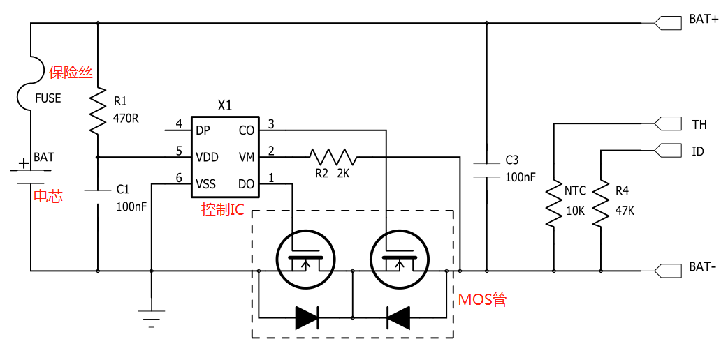 這個(gè)電路板根據(jù)組成電路不同,一般會(huì)有過(guò)放保護(hù)、過(guò)充保護(hù)、過(guò)流保護(hù)、短路保護(hù)以及控制IC失效之后的FUSE保護(hù)這幾種,下面會(huì)以一個(gè)常見的電路,講解這幾種保護(hù)的工作原理。