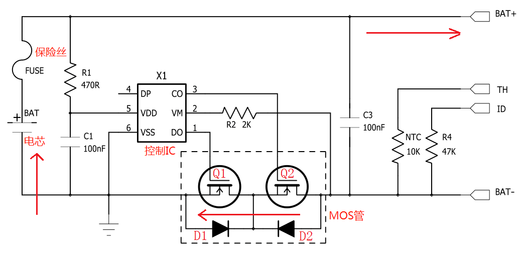 電池充電時(shí),電流(方向如箭頭所示)從電池包的正極流入,經(jīng)過(guò)FUSE后從負(fù)極流出,最下方的兩個(gè)MOS管均是導(dǎo)通狀態(tài)。